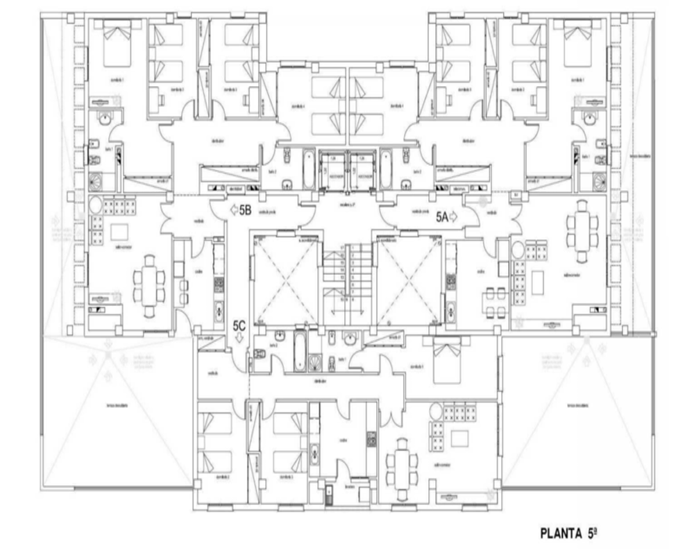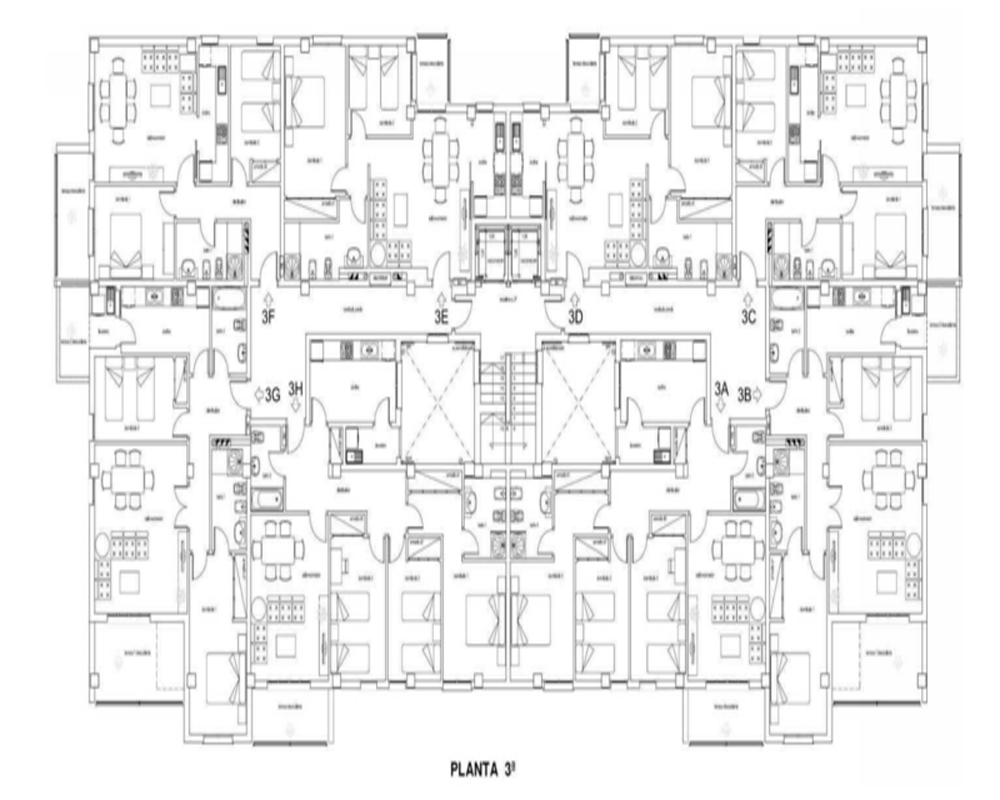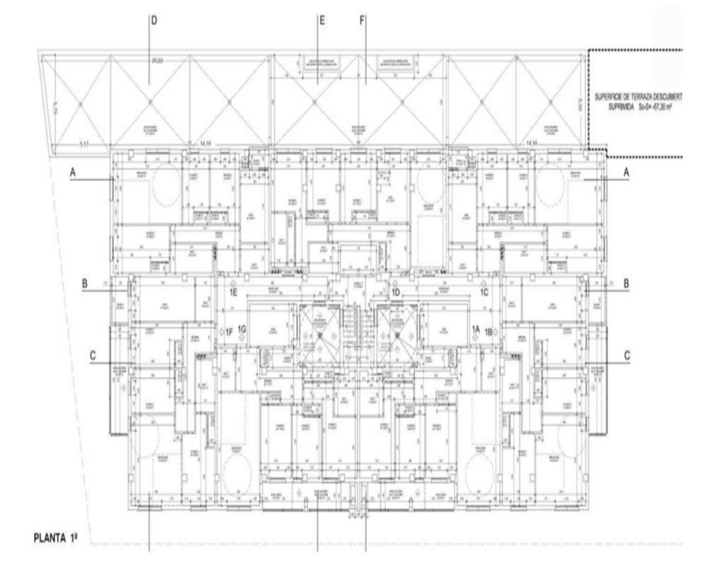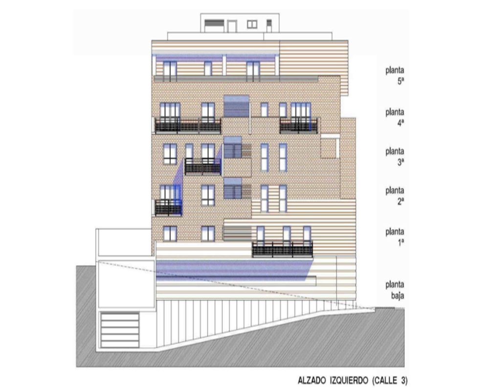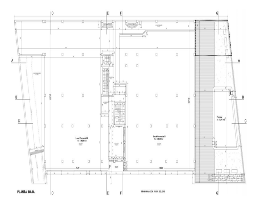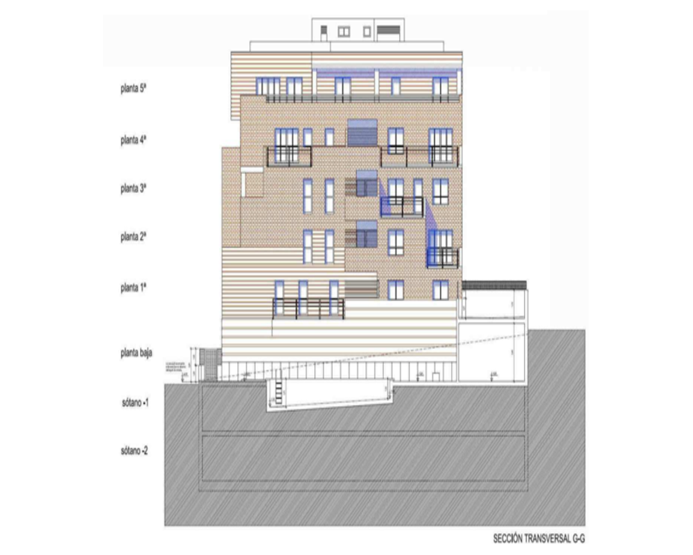 -Hipótesis: El edificio proyectado cuenta con 7 plantas sobre rasante (39 viviendas + 1 local) y 2 plantas bajo rasante (48 plazas de garaje). Previsto siete viviendas por planta entre la 1ª y la 5ª; Cuatro viviendas en la planta 6ª y el local en la planta baja.